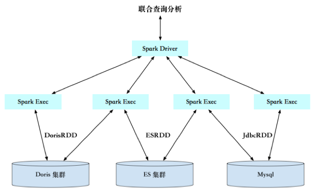 很多业务部门会将自己的数据放在不同的存储系统上,比如一些在线分析、报表的数据放在Doris中,一些结构化检索数据放在Elasticsearch中、一些需要事物的数据放在MySQL中,等等。业务往往需要跨多个存储源进行分析,通过Spark Doris Connector打通Spark和Doris后,业务可以直接使用Spark,将Doris中的数据与多个外部数据源做联合查询计算。