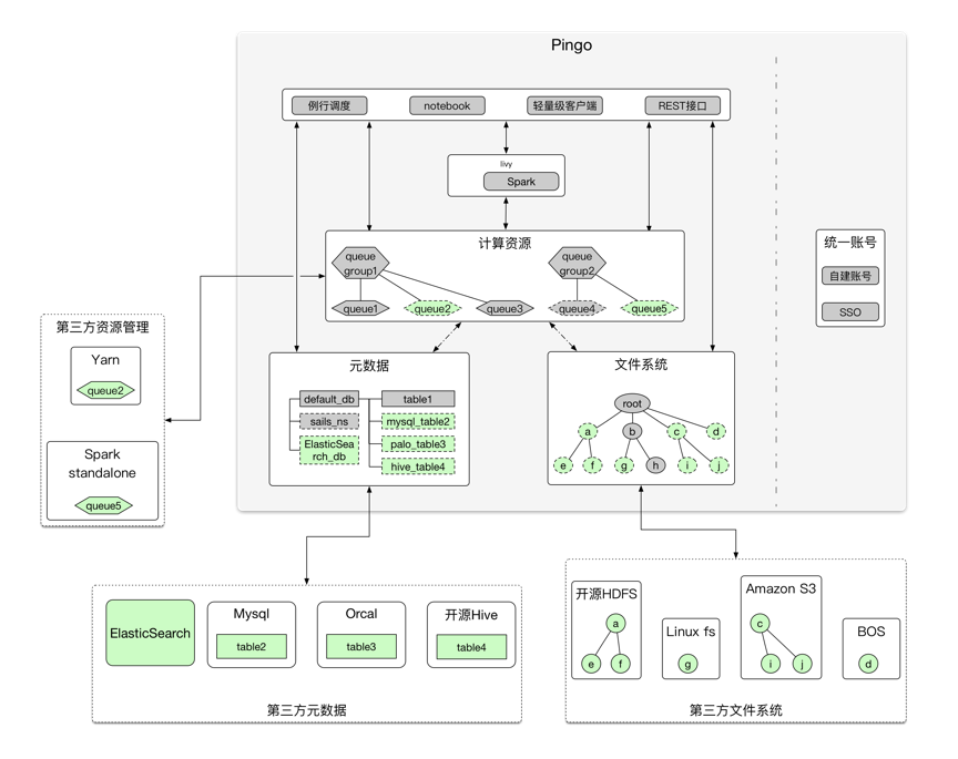 多存储后端数据联合查询:Pingo不仅自身能够提供文件的存储能力,而且能够无缝的接入多种外部的存储系统。无需停机维护和数据迁移,用户可以直接将存储在BOS,S3,私有HDFS等存储资源上的数据接入到Pingo中。Pingo可实现多存储混合查询,与此同时,Pingo还能够缓存常用的数据,加速计算过程。