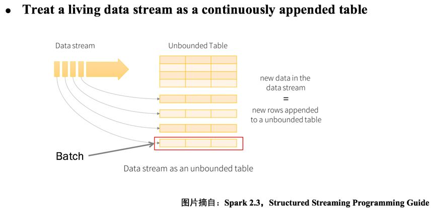 Structured Streaming与传统意义上的流式计算系统不同,它是一个微批次(micro-batch)的流式计算系统。其主要原理是将源源不断的数据,切分成一个一个的小数据块,其中每一小数据块称之为一个batch。当每次触发计算时,系统会处理一个batch中的数据,而batch和batch之间则是串行执行的。一个batch的计算,可以看做是一个Spark-SQL job的一次执行,故一个Structured Streaming作业可以看做是无穷多个job组成的一个不会停止作业。
