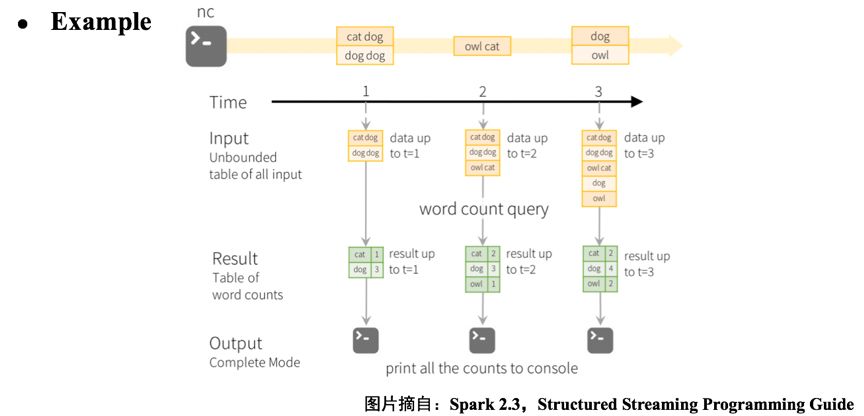 nc是指linux的netcat指令,input数据通过socket传入。在时间点1,系统接收到4条数据作为一个batch进行计算,产生了结果(cat, 1)(dog, 3)。在时间点2的时候又来了两条数据,这两条数据会成为一个新的batch进行计算,新的计算结果会加到最终的结果里(cat, 2)(dog,3)(owl,1)。以此类推,每来一批新数据,将这批数据作为一个batch进行计算,然后对结果进行更新。Structured Streaming就这样源源不断的将输入数据切分为一个一个小的batch,然后执行计算。