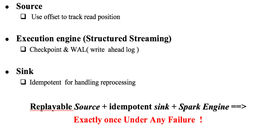 2. Execution engine记录checkpoint。引擎会在处理每个batch之前,先写WAL来记录当前batch要读哪些数据。如果发生failover,可以利用checkpoint对batch的数据进行重新计算。故Source + Execution engine做到了at-least once语义,即数据的不丢