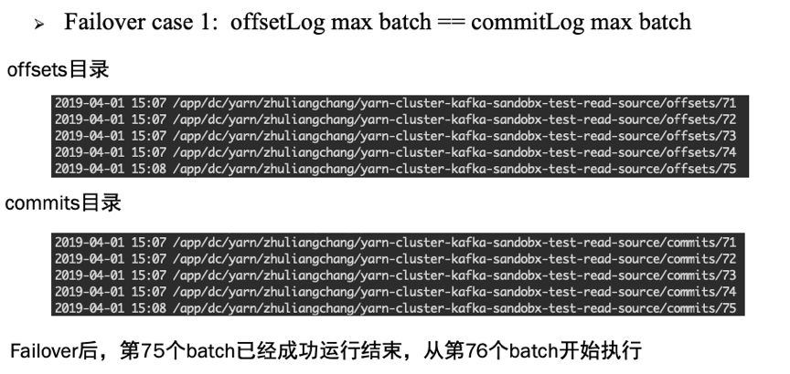 Case 1中,因为OffsetLog中记录的最新batchId和CommitLog中记录的最新batchId相等,所以Failover后,引擎发现第75个batch已经成功运行结束,且没有batch需要重放,则从第76个batch开始继续执行。