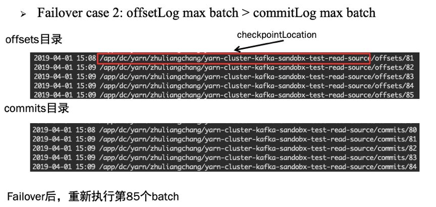 Case 2中,OffsetLog中最新的batchId是85, 而CommitLog中记录的最新的batchId是84,两者不相等,说明作业failover发生在batch 85执行过程中,此时需要重新执行batch 85。