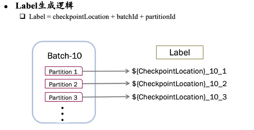 因此,由3元组(checkpointLocation + batchId + paritionId)组成的label可以唯一的确定一个structured streaming作业中的一段数据。那么只要确保在failover前后同一段数据对应的label相同,即可以此来去重以实现exactly-once语义。