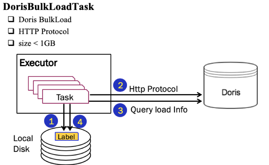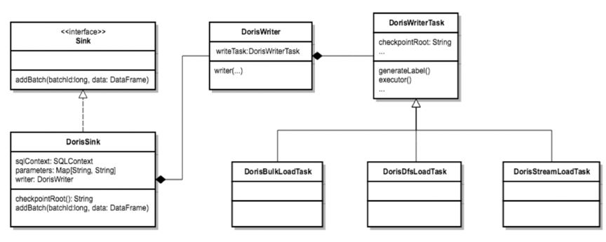 这里重点关注DorisWriterTask,该task是executor中实际进行计算的task逻辑,它有3种实现,分布对应了Doris的3种Load模式(Bulk load, Broker load, Streaming load)。下面主要介绍Bulk load和Broker load。Streaming load将在近期实现。