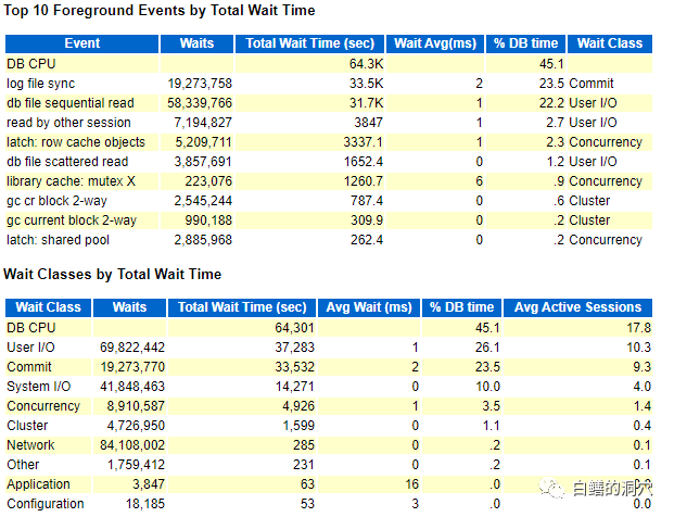 降低红框中的这些等待,肯定能降低每个事务的开销,从而提高每个事务的响应时间,从某些方面提高总体并发的能力。不过我们看得出,哪怕把这些全优化了,也还不够15%-20%提升这个目标。因此除此之外,我们还要再去分析如何提高并发处理能力的问题。比如闩锁的等待、共享池的等待、锁等待、BBW、GES/GCS等待等。同时提高一些关键缓冲池的命中率也有助于提高并发处理能力。