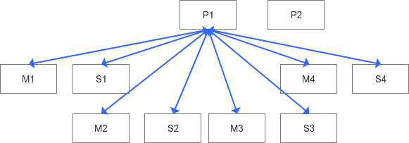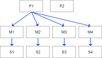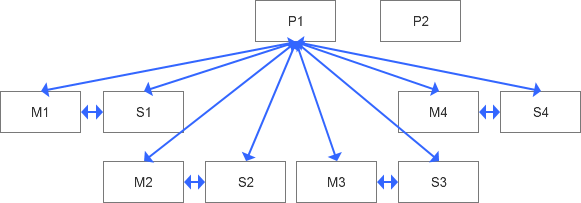 目前集群的整体结构设计如下,其中P1,P2为中间件节点,P2暂时未投入使用,M1->M4是物理分片节点,每个物理分片包含4个逻辑分片,所以一张表被拆分为了16份,目前集群中的数据表为一张周期表,按日写入,即表类似于test_20210105
