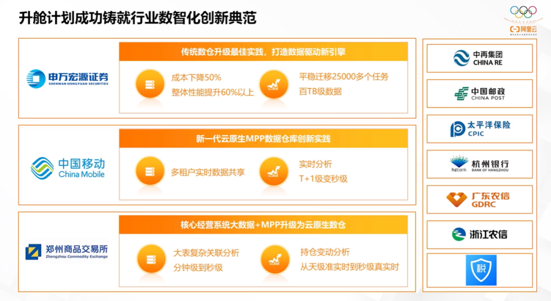 此外,不仅作为证券行业“实力派”代表的申万宏源实现了“升舱”转型,广东移动、中国再保险集团、太平洋保险、广东农信、中国邮政、国税总局、郑州商品交易所等30多家金融、电信行业标杆企业,通过AnalyticDB的平滑升级,也相继实现了“升舱”。