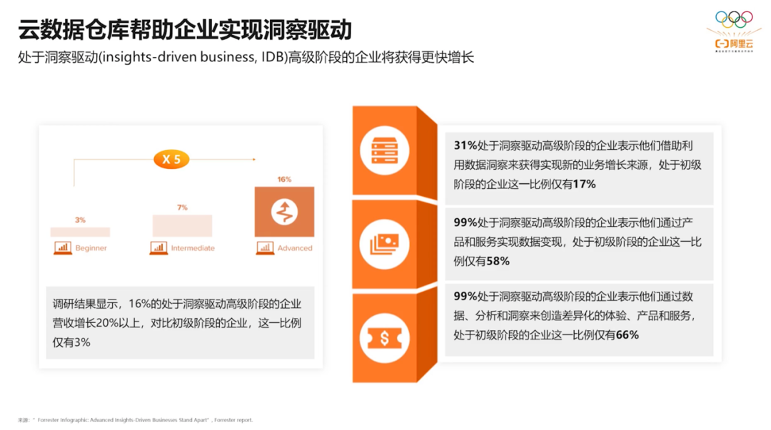 Forrester首席分析师Danny Mu(穆飞)分析建议,企业应该通过数据分析来产生洞察,并运用数据洞察来引领行动,从而升级成为洞察驱动的企业,这样更有可能获得高速的业务增长。同时,强大的云数据仓库是实现洞察驱动的基础。基于先进的云数仓,整合多方应用,形成洞察系统,让洞察力能够直接推动企业决策和行动。