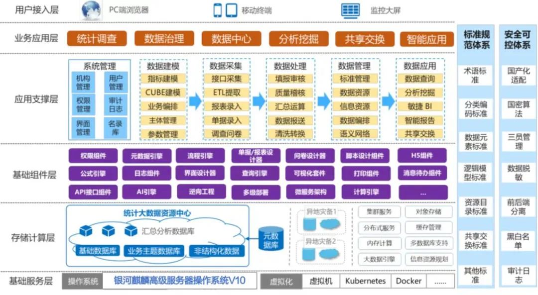 长期以来,统计和报表是各政府部门业务管理的重要手段,活跃在政务业务的各个领域,统计业务系统是政务管理中重要的数据生产系统。随着政府数字化转型工作持续推进,具备数智化服务能力的新型平台成为迫切需求。麒麟软件携手久其软件,在全面国产化的基础环境下,推进现代信息技术与统计工作深度融合,创新统计信息化服务方式,建立以数据为核心的统计系统,赋能统计工作创新发展的要求,共同打造基于银河麒麟操作系统的政府统计信息化解决方案。