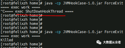 //添加钩子,Hook线程sleep 10sRuntime.getRuntime().addShutdownHook(new ShutDownHookThread(10));//增加超时保护,超时5s,强制关闭JVMRuntime.getRuntime().addShutdownHook(new JvmShutdownSafeguard(5));//业务工作work();//正常退出System.out.println("==== normal exit ====");