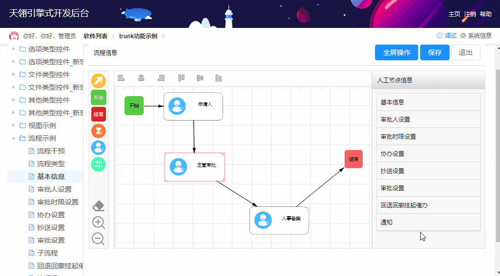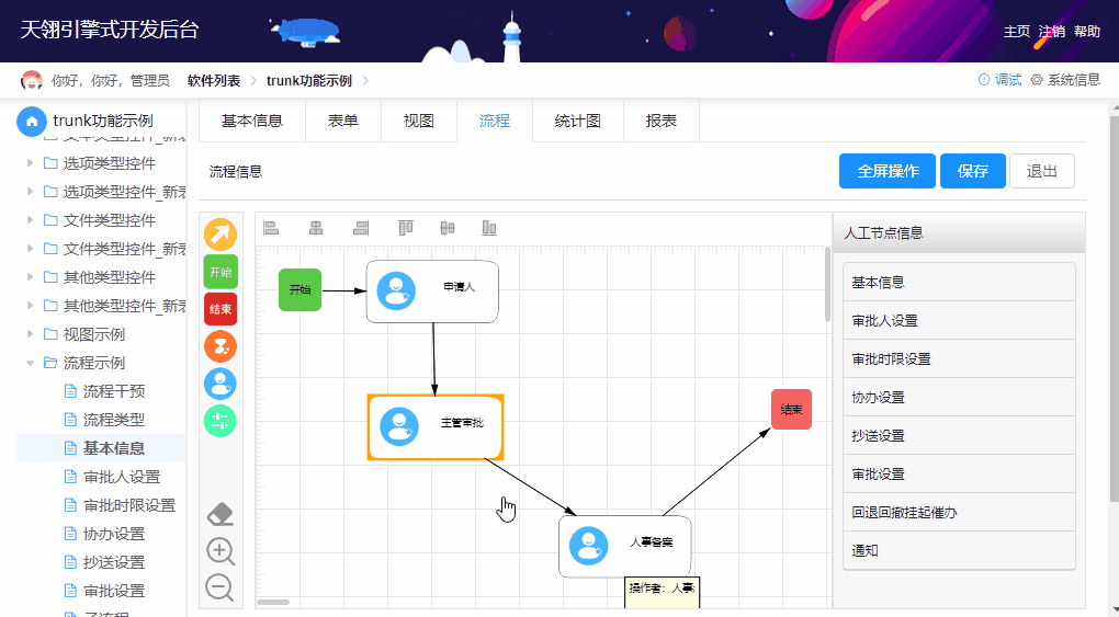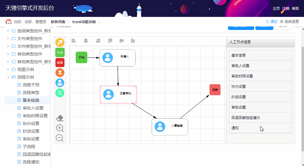 (1)审批节点设置,包括审批送出、审批到达、节点通过条件。