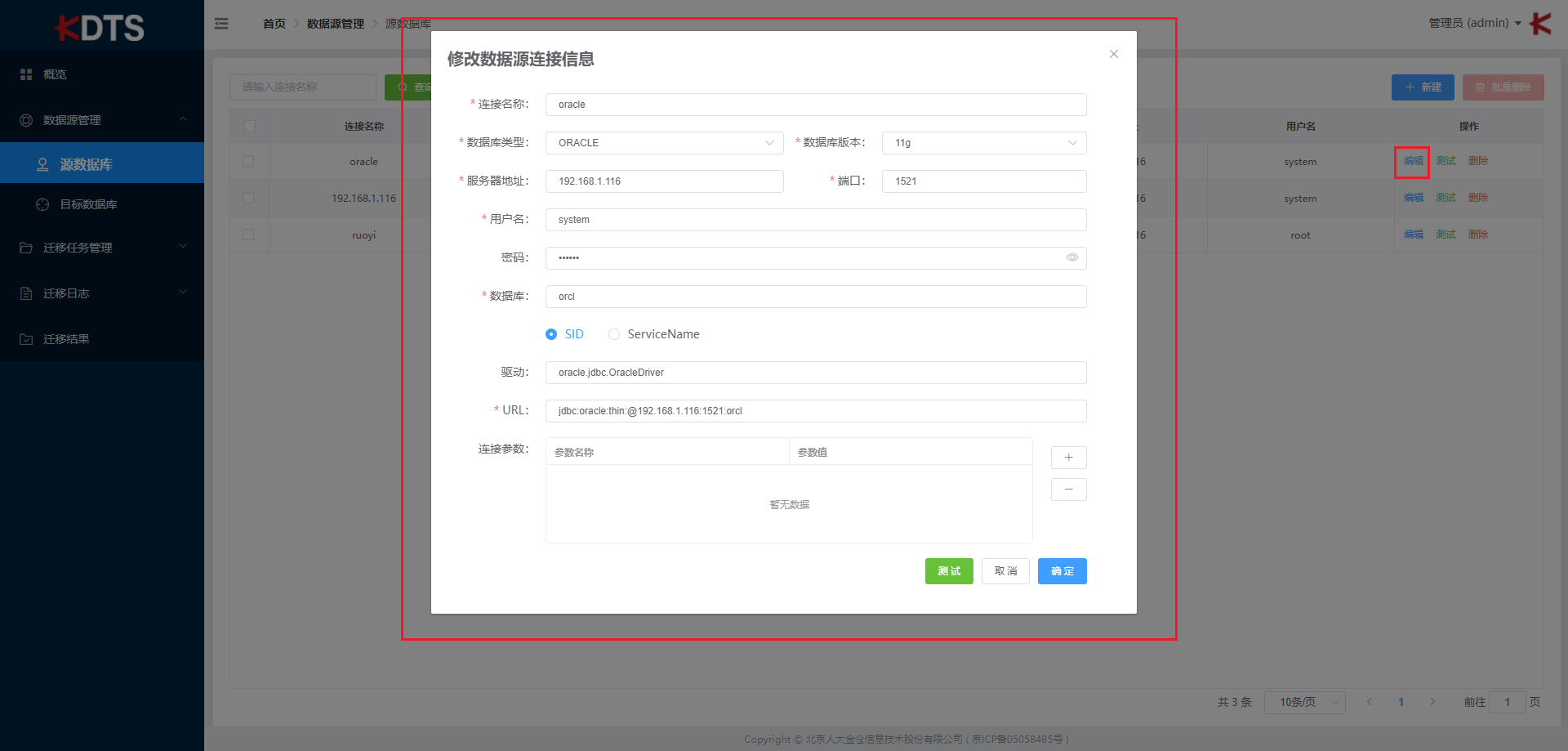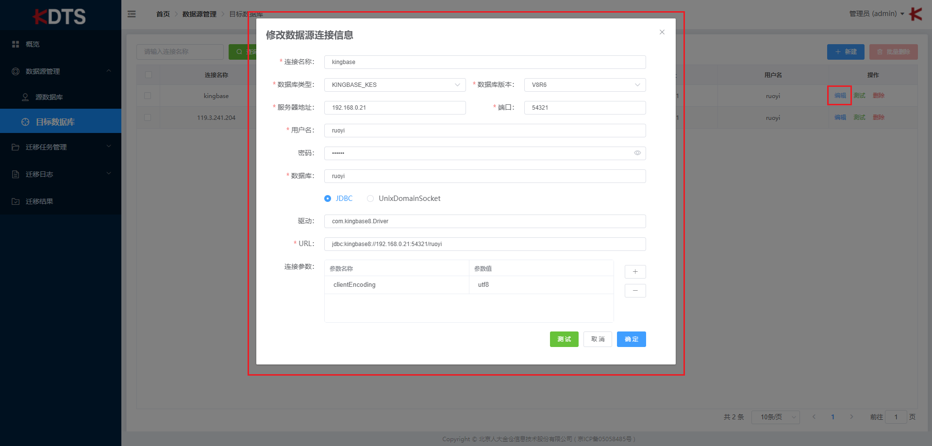 如果您需要修改数据库连接相关信息,可点击 “编辑” 按钮修改数据源连接信息,修改后要保证数据源连接依旧成功。