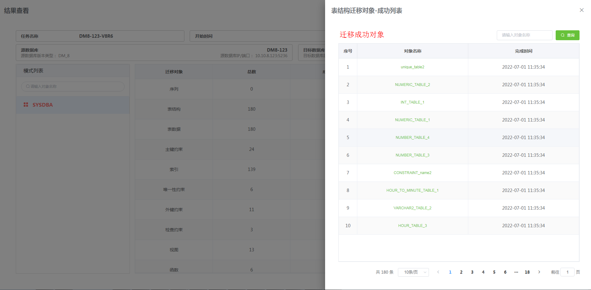 点击 “成功数” 即显示 “迁移对象成功列表”。可点击对象名查看具体 DDL 语句。