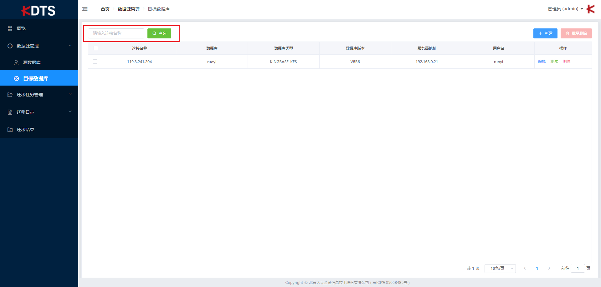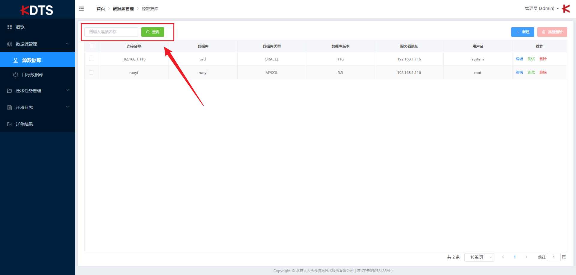 在搜索框内输入连接名称关键字,点击 “查询” 按钮可快速找到对应的源数据库,支持模糊搜索。