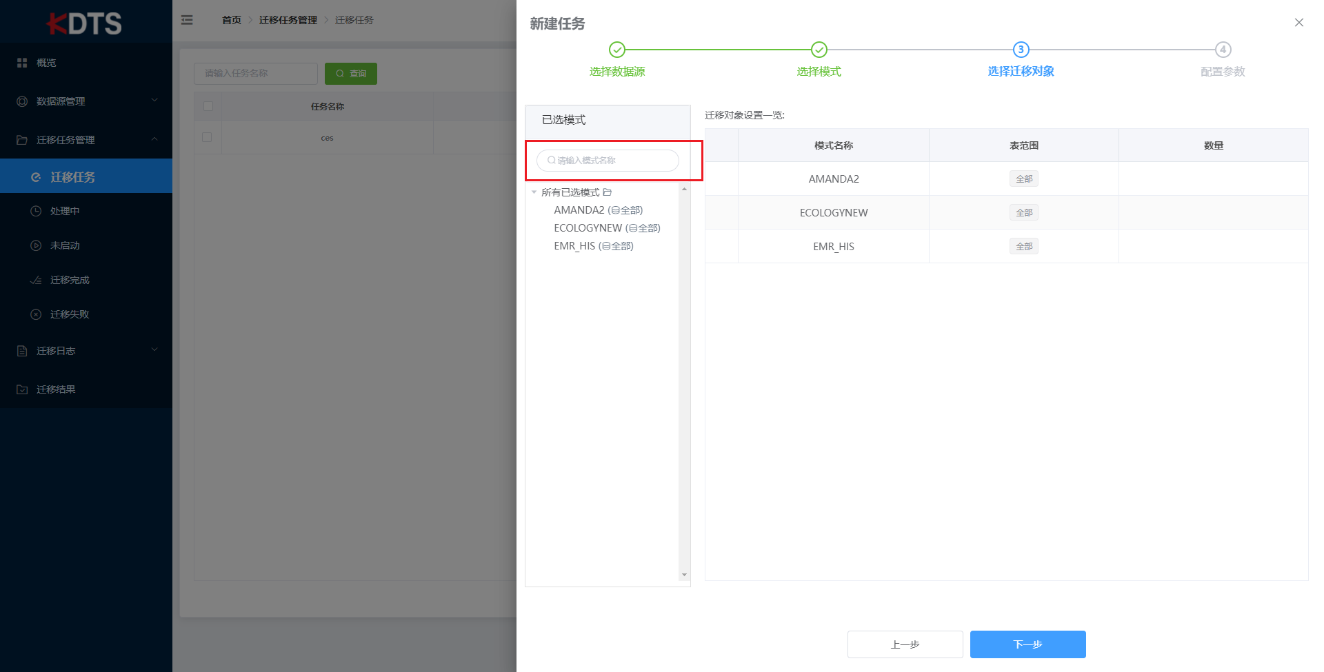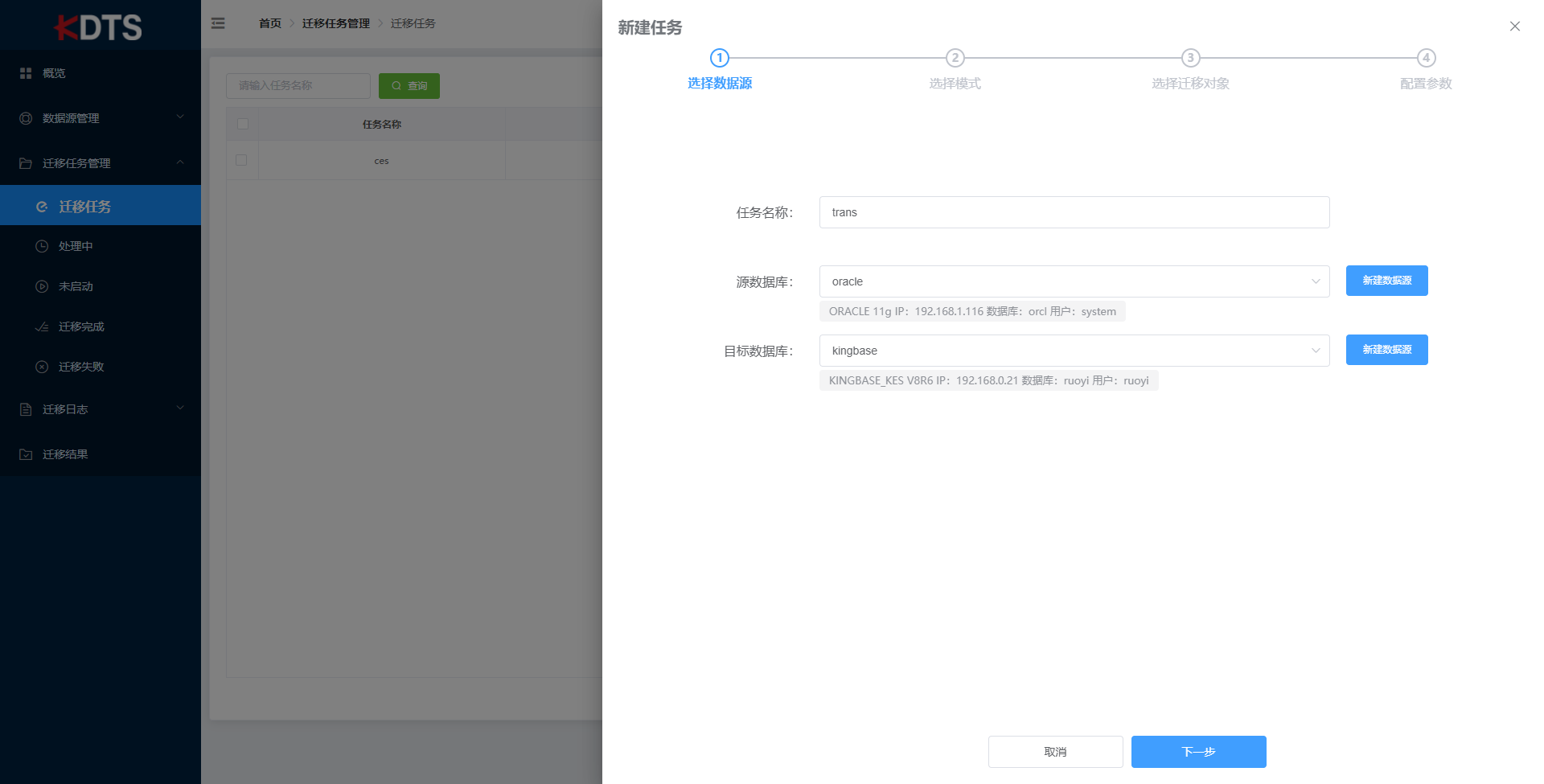 新建迁移任务以进行数据迁移。新建任务包含四步:“选择数据源”、“选择模式”、“选择迁移对象”、“配置参数”。