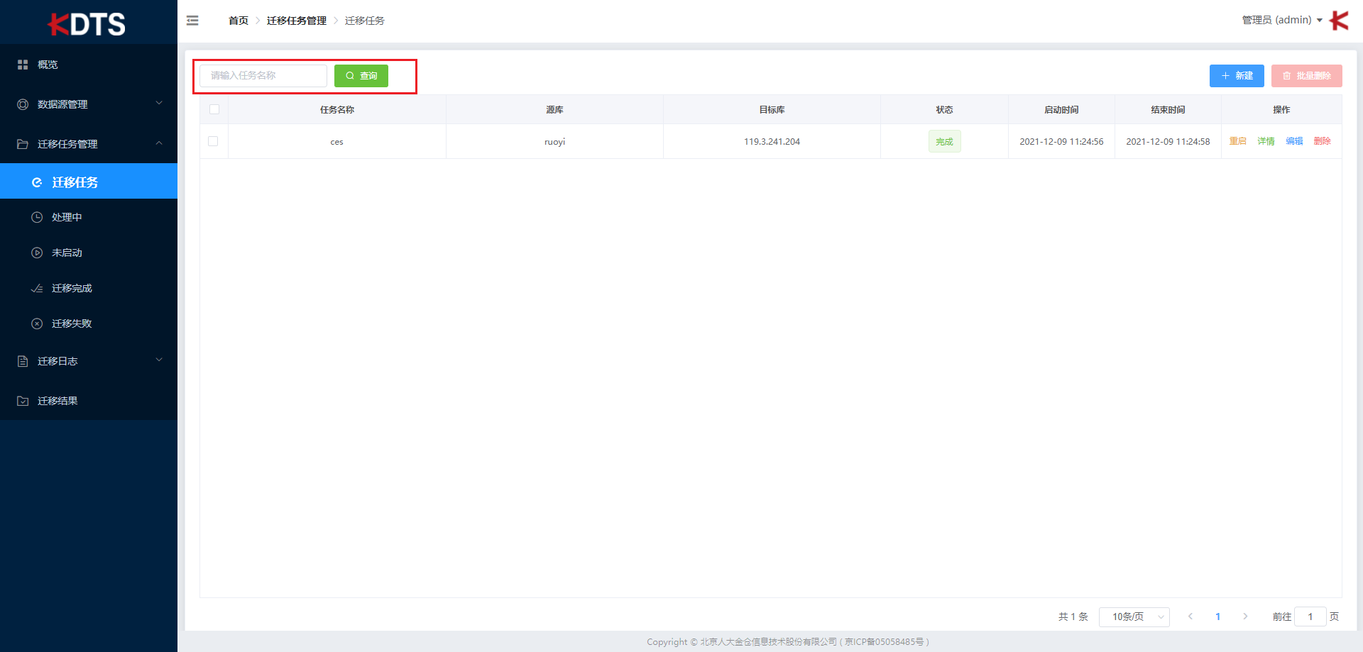 在搜索框内输入任务名称关键字,点击 “查询” 可快速找到对应的迁移任务。