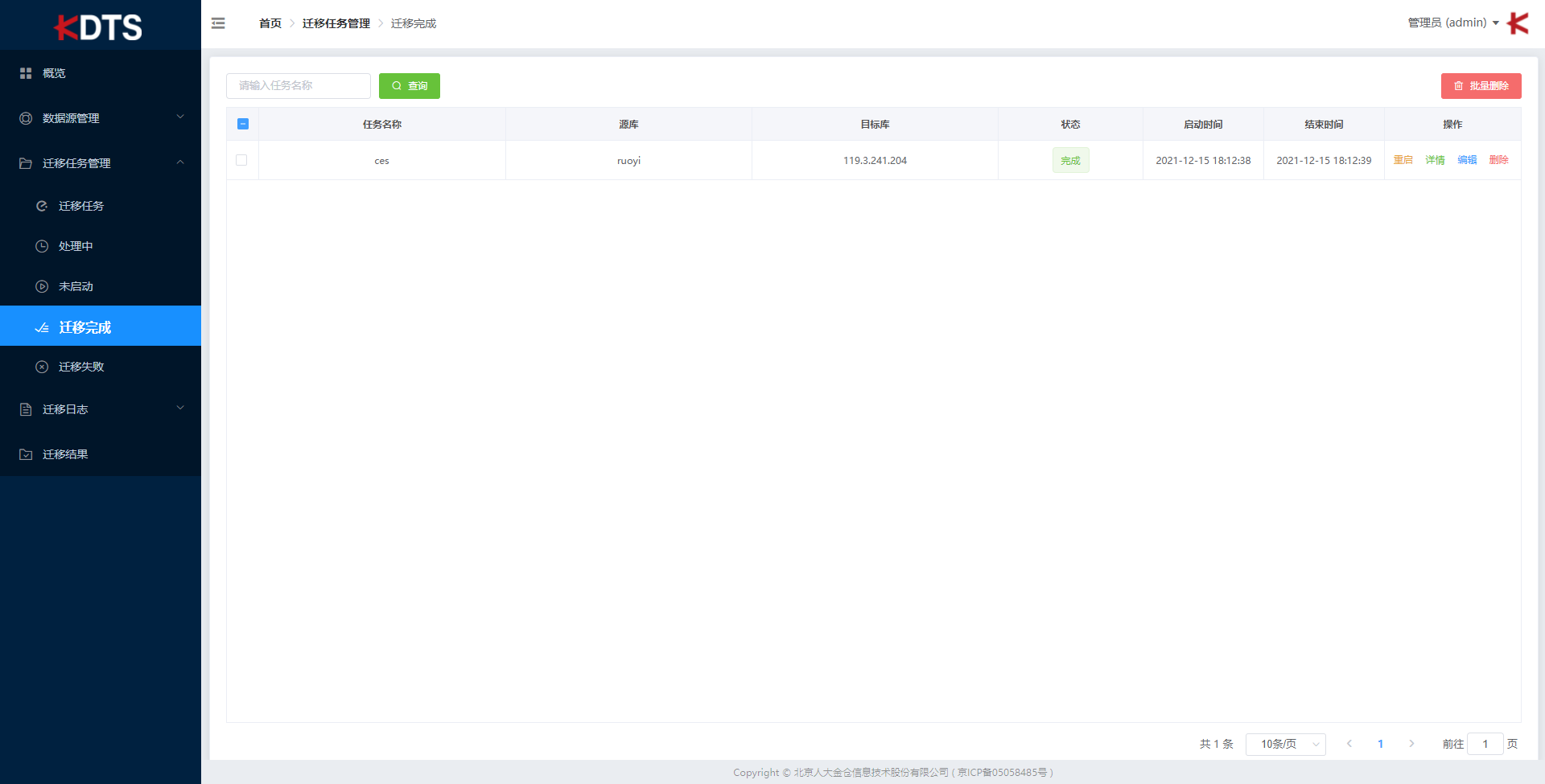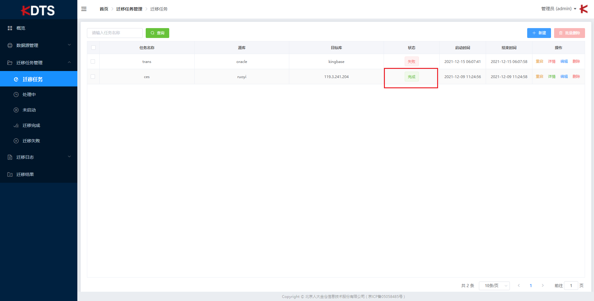 迁移结束 “状态” 栏显示 “完成”,则迁移任务成功。