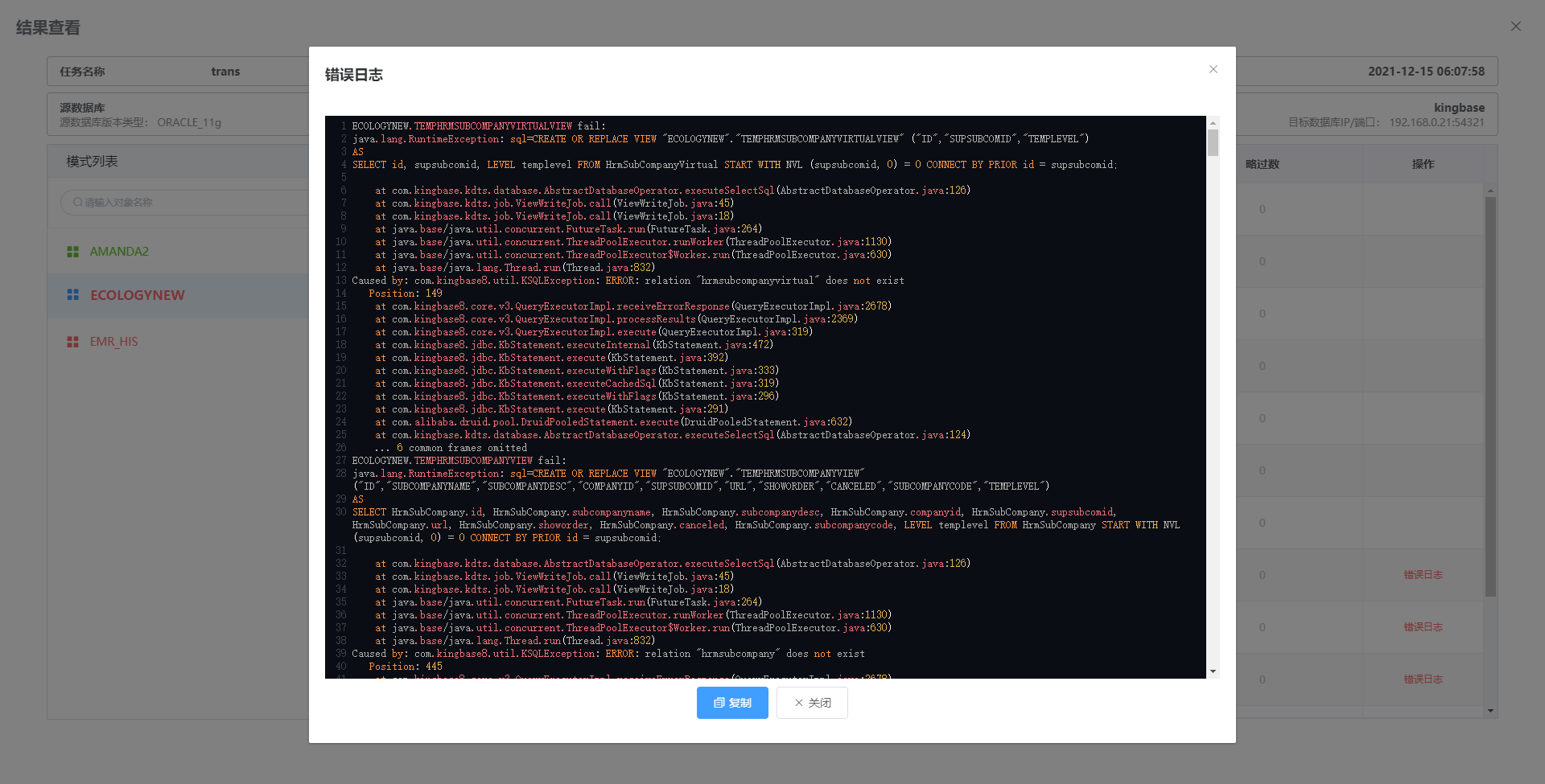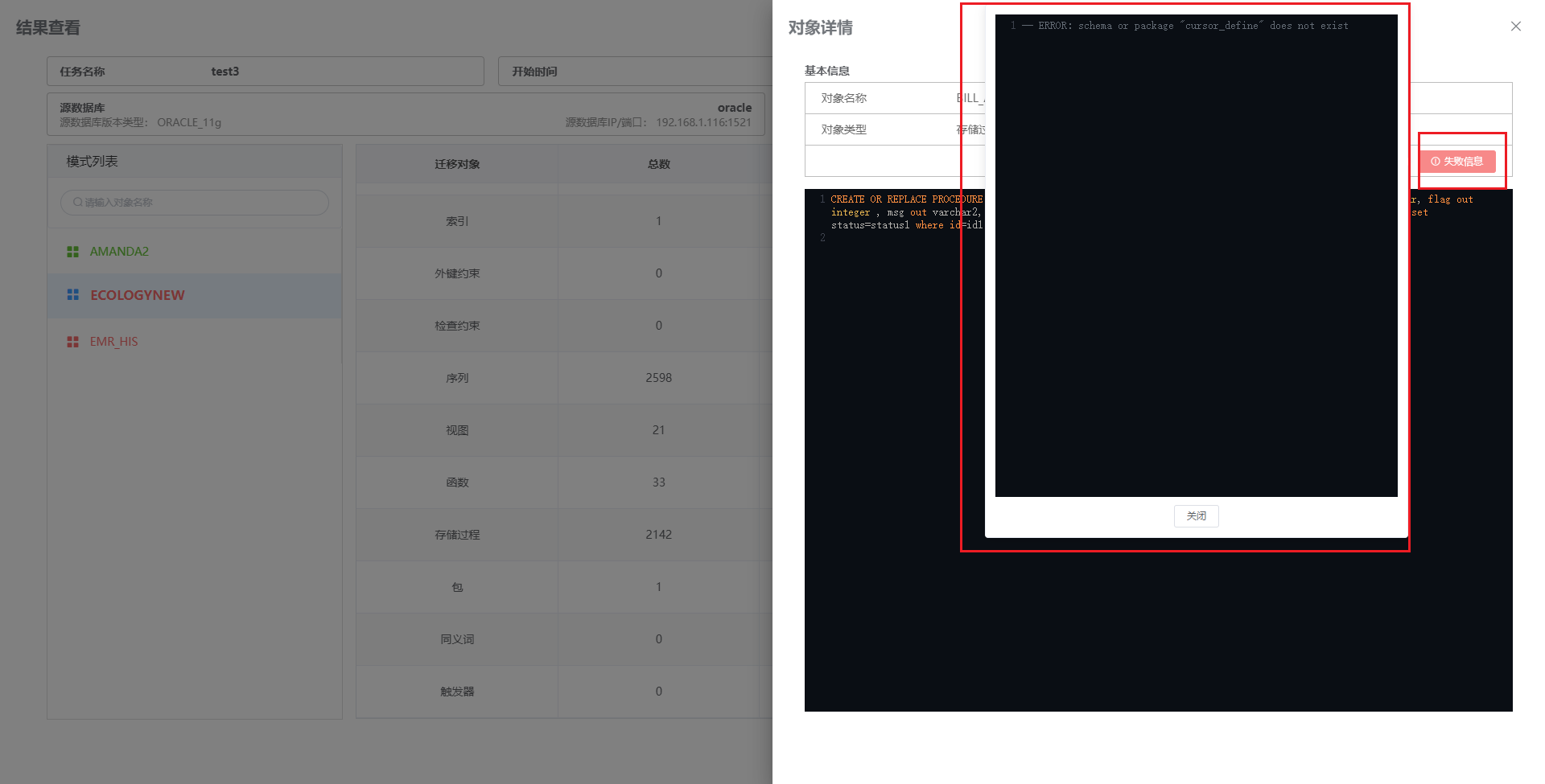 点击 “失败数” 即显示 “迁移对象失败列表”。可点击对象名查看具体 DDL 语句。