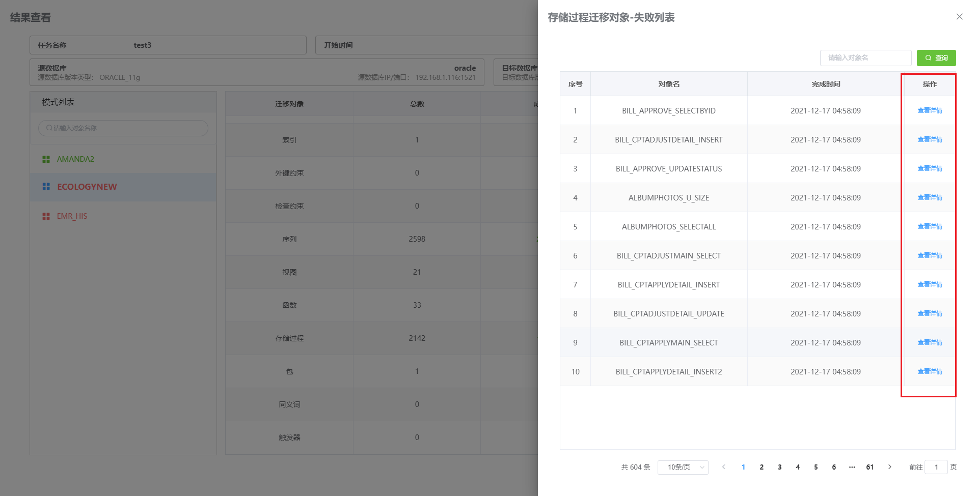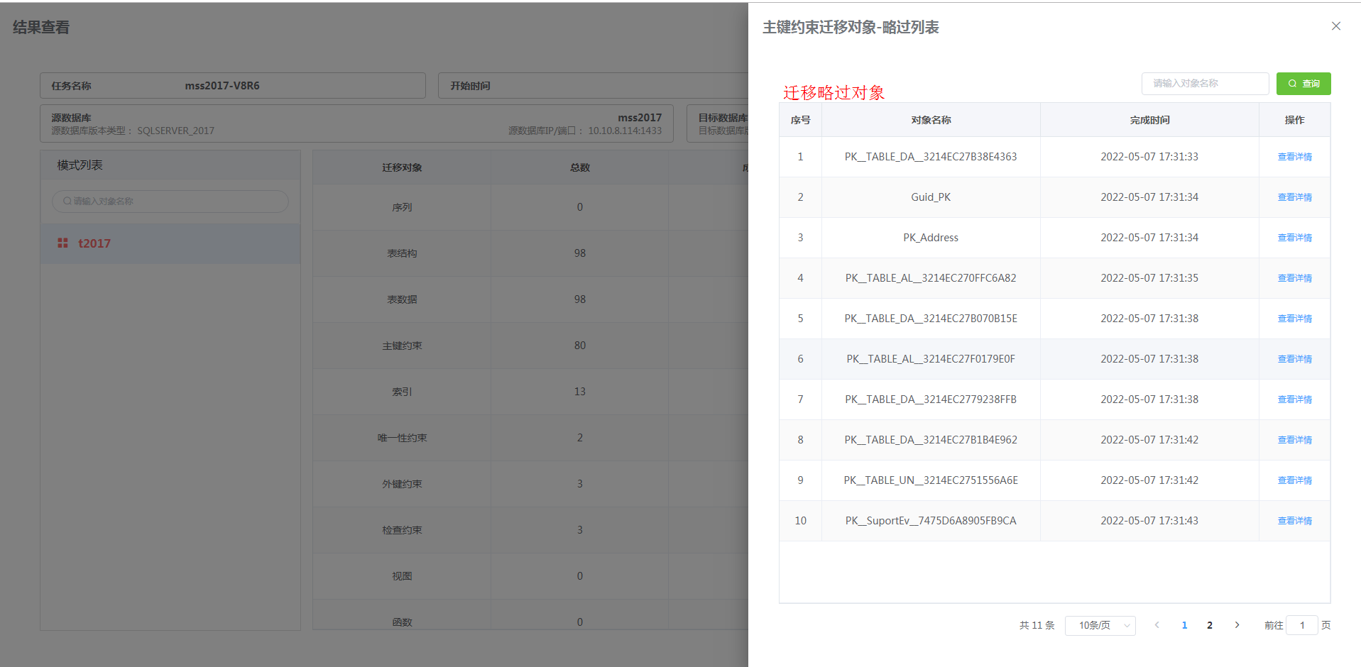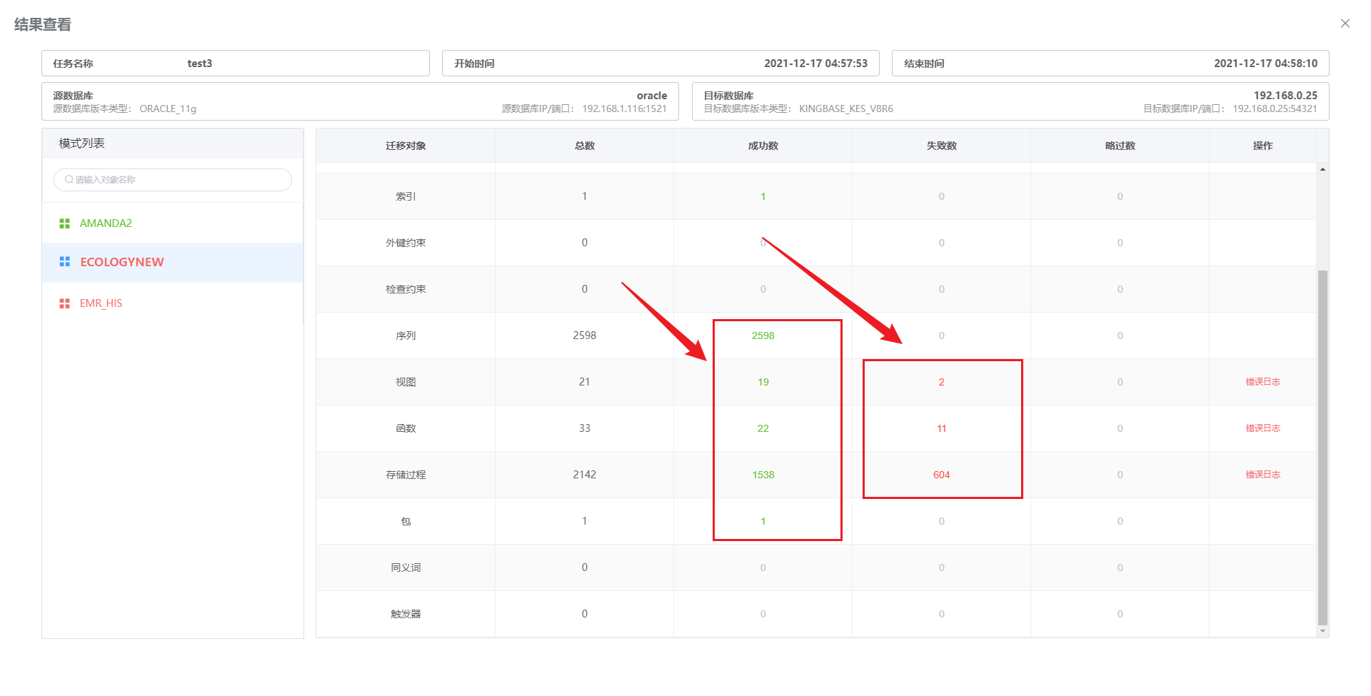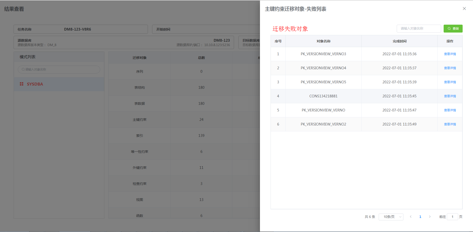 在 “详情” 中点击成功数、失败数或忽略数即可显示迁移对象列表。