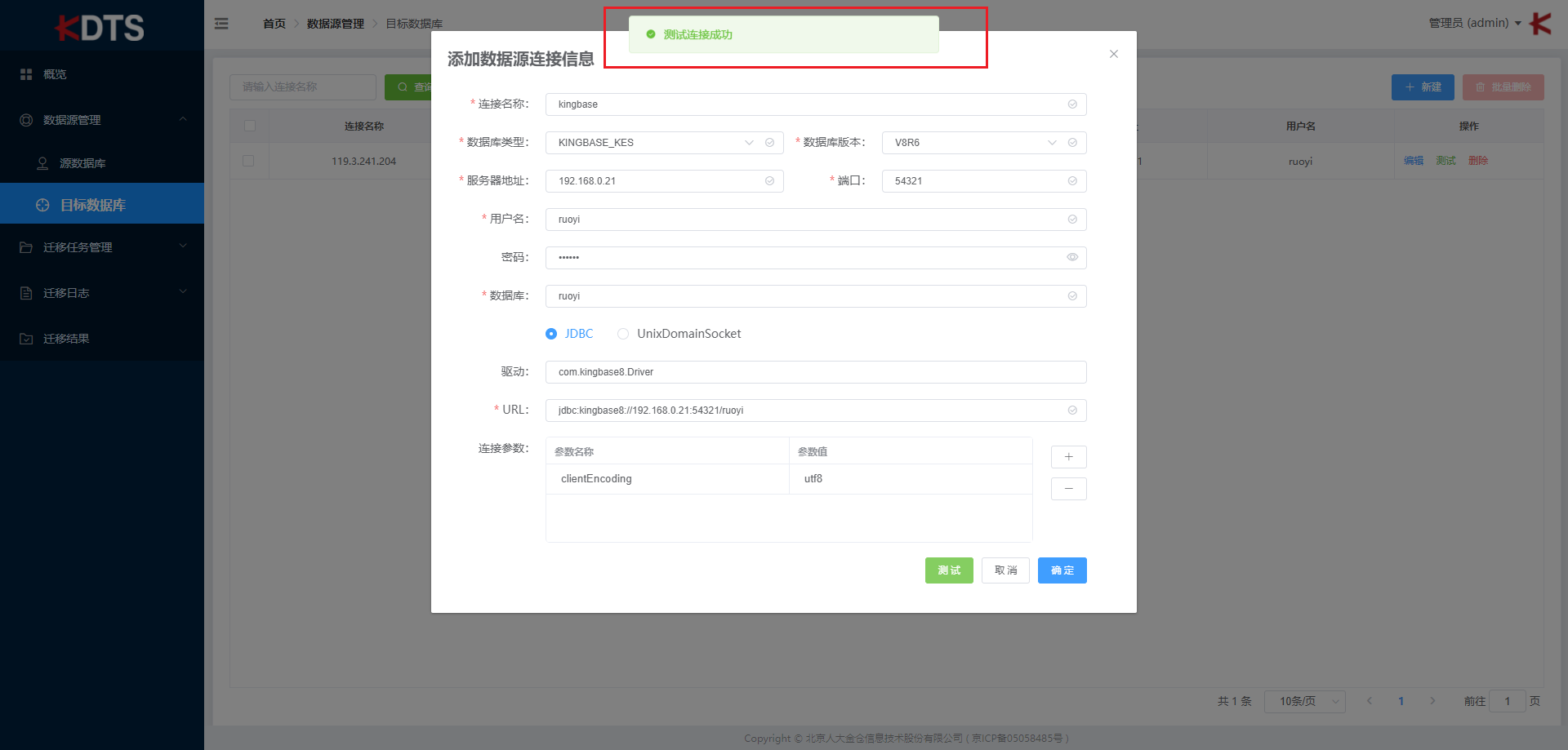 在目标数据源中仅支持 “Kingbase” 数据库类型。