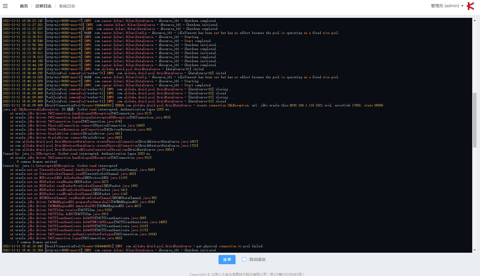 “系统日志” 显示 error、warn、info 级别的日志。如需自动滚动日志可以点击 “自动滚动” 复选框。