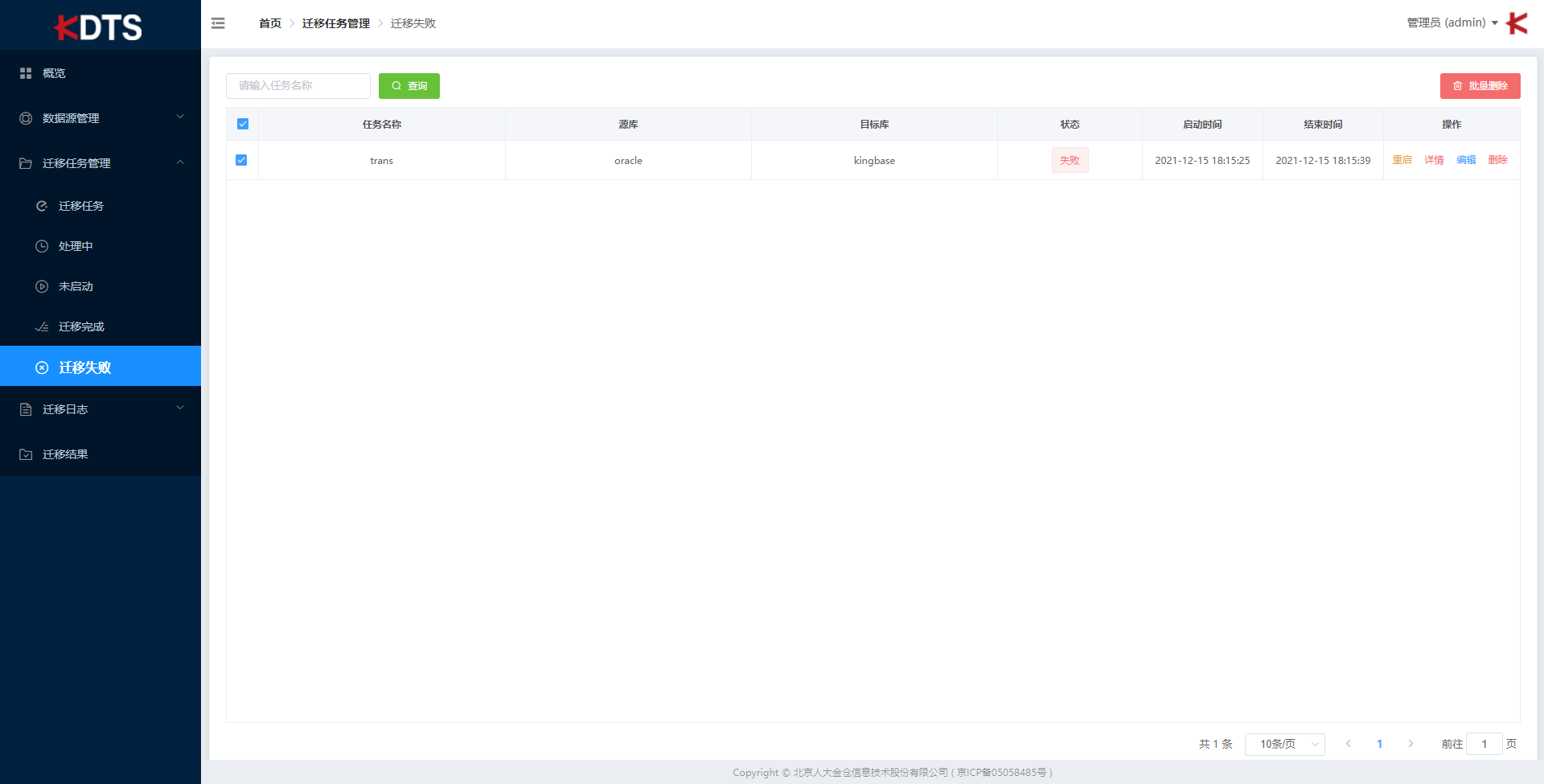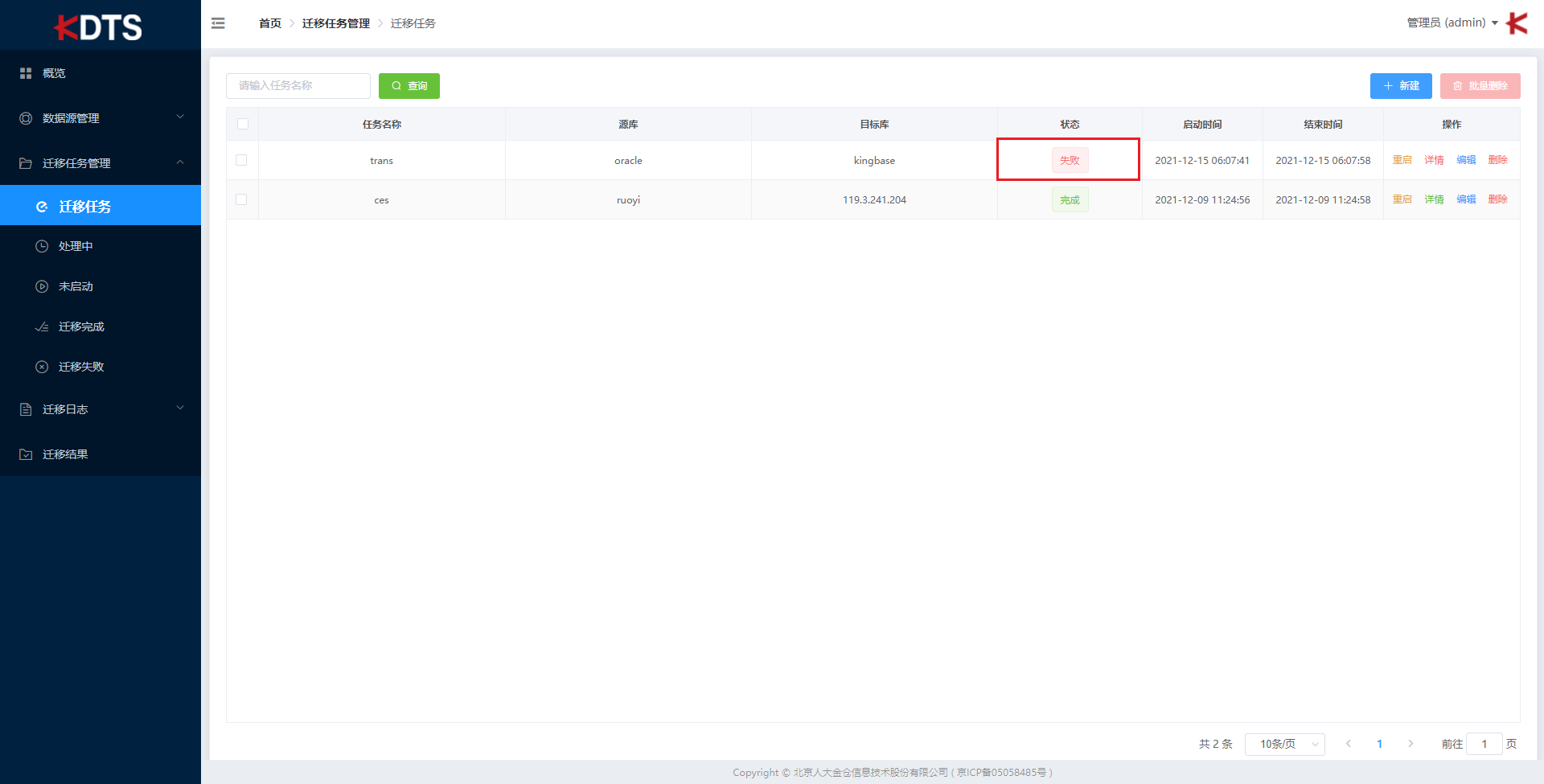 迁移结束 “状态” 栏显示 “失败”,则迁移任务失败。失败后可点击详情查看日志有助于解决问题。