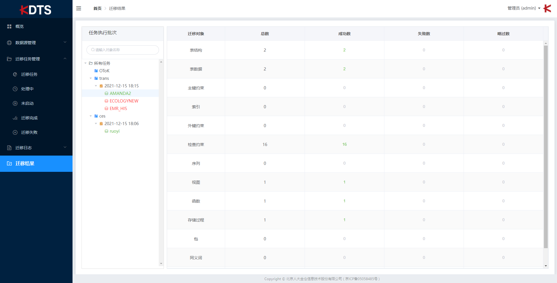 “迁移结果” 功能的工作区包括 “任务执行批次”、“迁移对象”、“总数”、“成功数”、“失败数”、“略过数”、“操作”。您可以查看历史迁移任务执行的每次记录,以及每次迁移的对象、成功数、失败数、查看失败任务的错误日志。