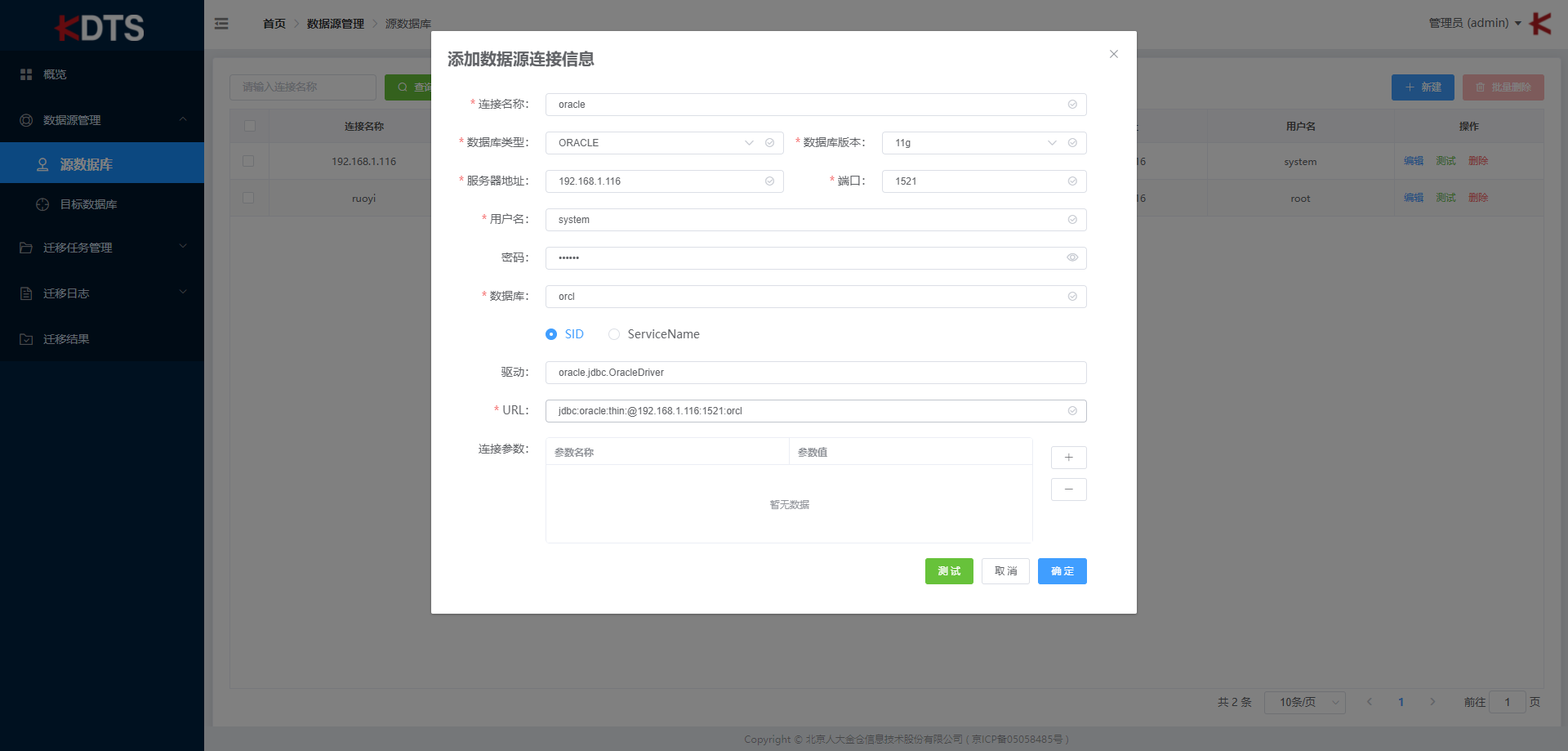 新建源数据库连接,填写需要的相关数据源连接信息,包括: “连接名称”、“数据库类型”、“数据库版本”、“服务器地址”、“端口”、“用户名”、“密码”、“数据库”、“驱动”、“URL”、“连接参数”。
