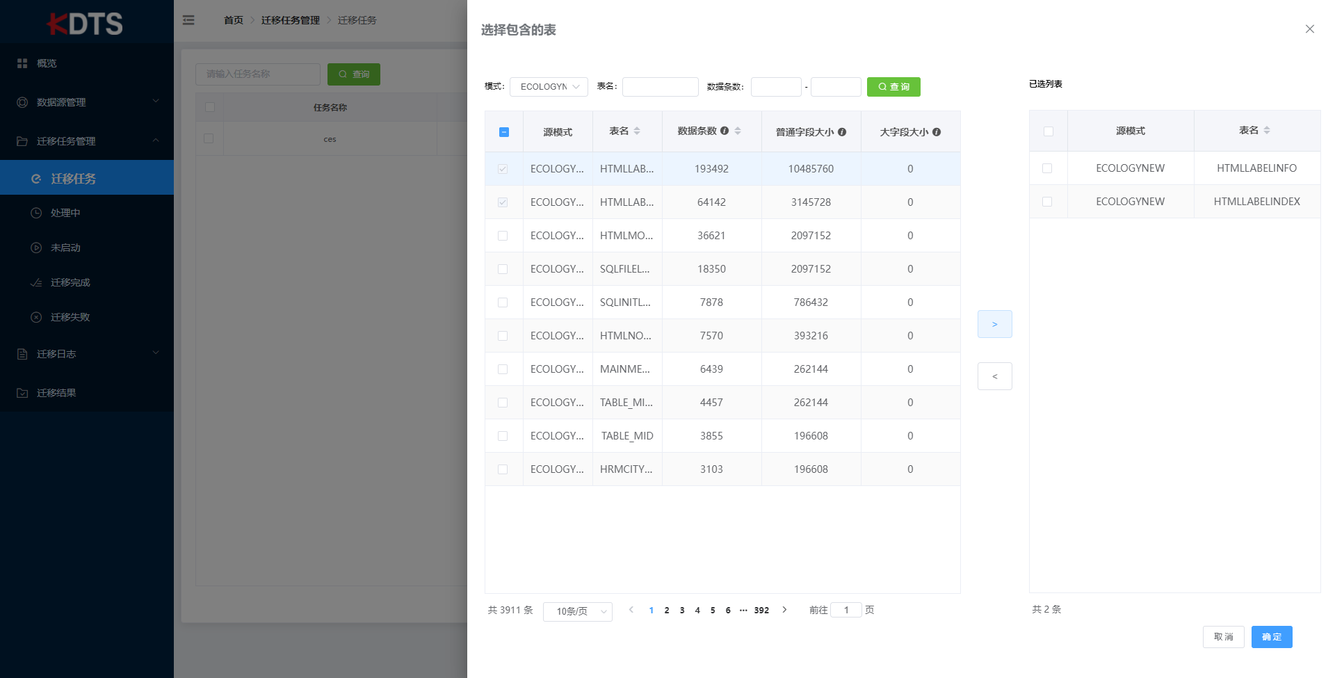 对迁移的表进行排序,可通过 “按行数和大字段大小交替”、“行数”、“大小进行排序”(默认是按行数和大字段大小交替)。