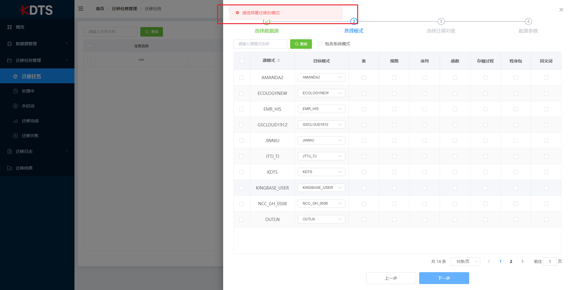 根据您的数据迁移所需选择对应模式(如需选择模式在系统模式中可选中 “包含系统模式” 复选框)的表、视图、序列、函数、存储过程、程序包、同义词。当模式较多时也可以通过左上方的查询框进行检索。 请您至少选择一种模式,否则将收到错误提示,以至于不能完成新建任务。