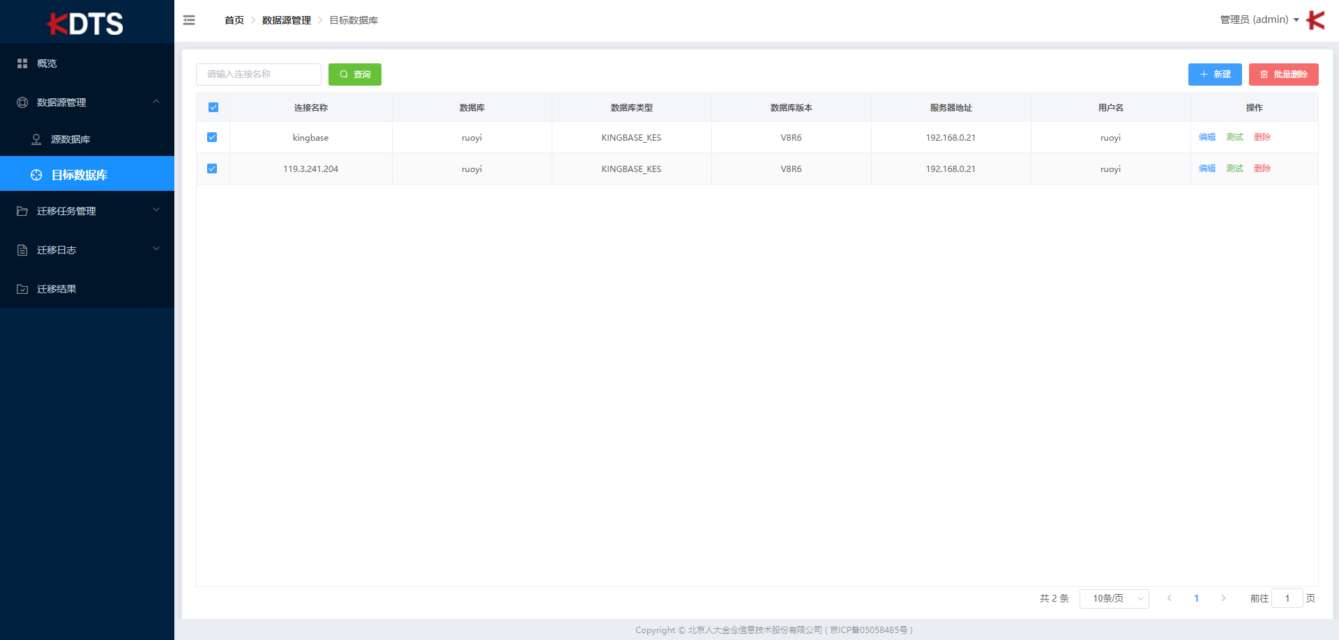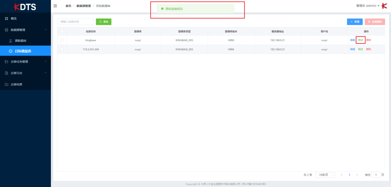 列表显示您所建立的所有目标数据源连接的详细信息,包括: “连接名称”、“数据库”“数据库类型”、“数据库版本”、“服务器地址”、“用户名”、“操作”。