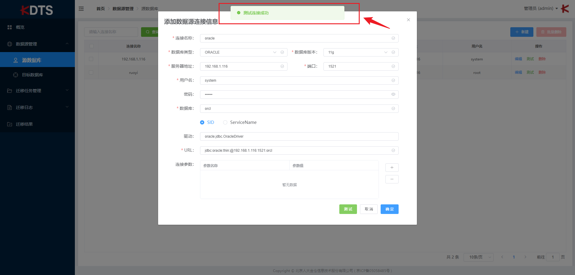 测试此数据源是否连接成功,连接成功将会弹出 “测试连接成功” 提示框,失败会显示出错原因,有助于您了解连接失败原因。