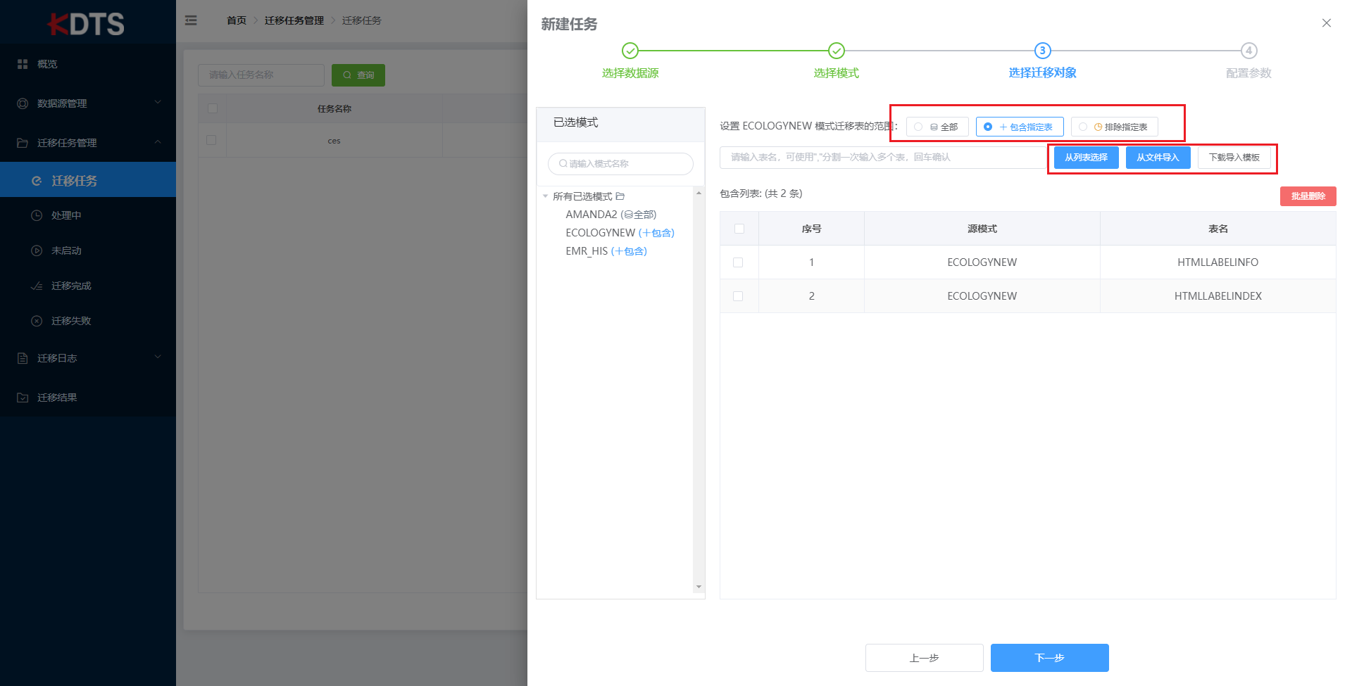 可迁移此模式下全部表,也可以指定或排除部份表,当您选择 “包含指定表” 或 “排除指定表” 时,请您通过 “从列表选择”、“从文件导入” 或者在输入框内输入表名将数据添加到包含列表中,如您未添加数据,则会提示错误导致无法进行下一步并完成新建任务。