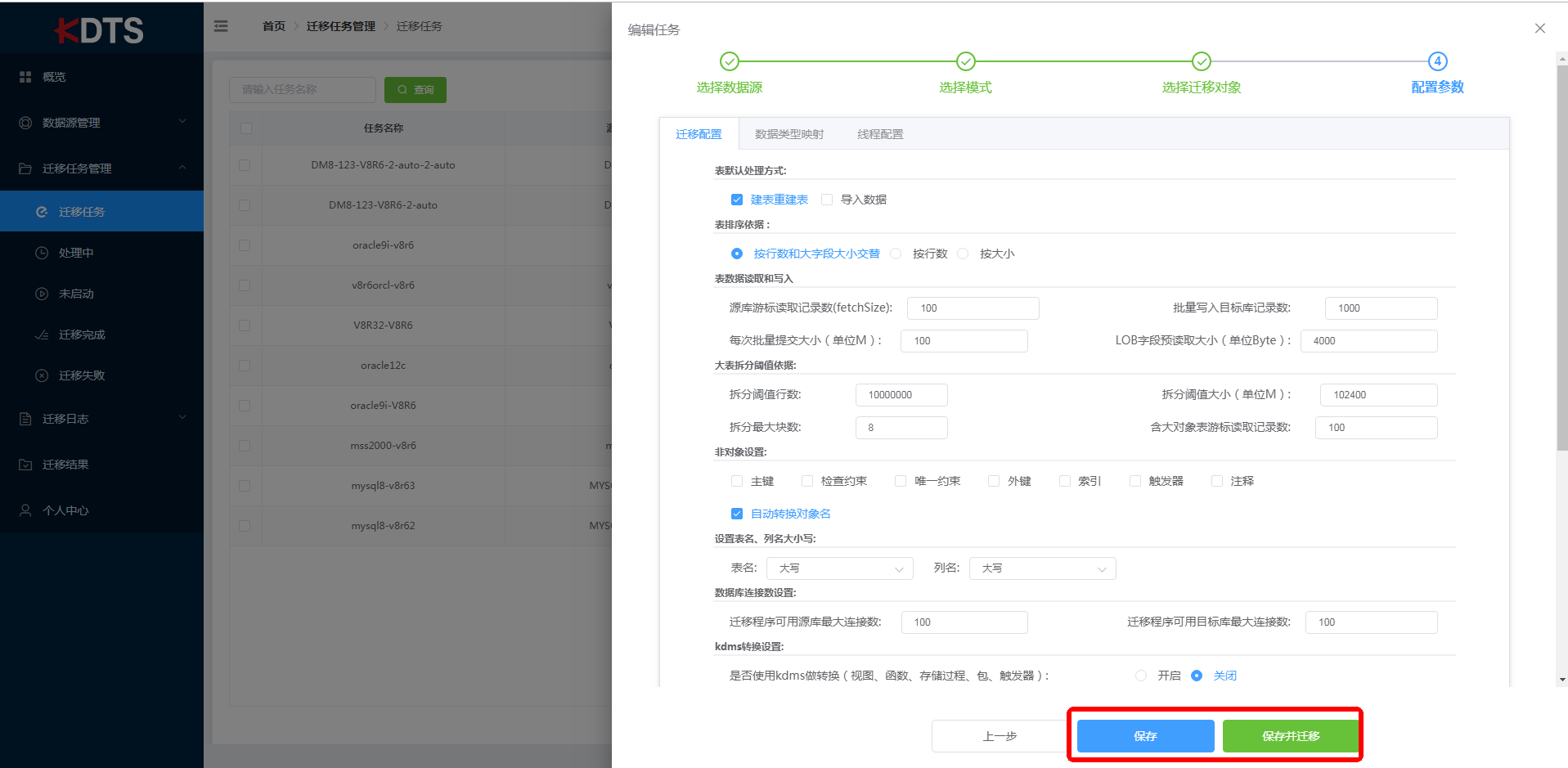 您可以通过对参数的更改获得预估的数据迁移结果。其中迁移配置包括 “表默认处理方式”、“表排序依据”、“表数据读取和写入”、“大表拆分阈值依据”、“非对象设置”、“设置表名”、“列名大小写”、“数据库连接数设置”。