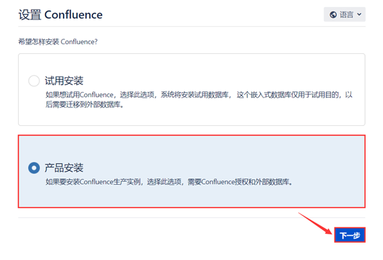 3、设置confluence界面,选择”产品安装”,点击下一步