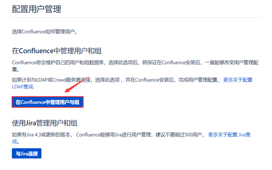 4、配置用户管理界面,选择”在Confluence中管理用户和组”