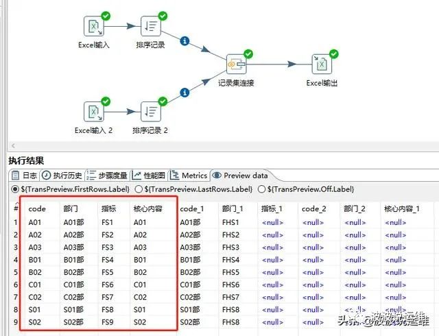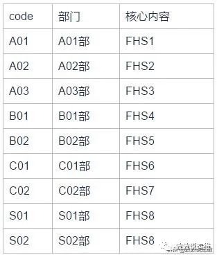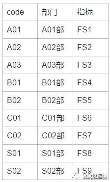 需求:将A表(code,部门,指标)、B表(code,部门,核心内容)组合输出结果:S表(code,部门,指标,核心内容)