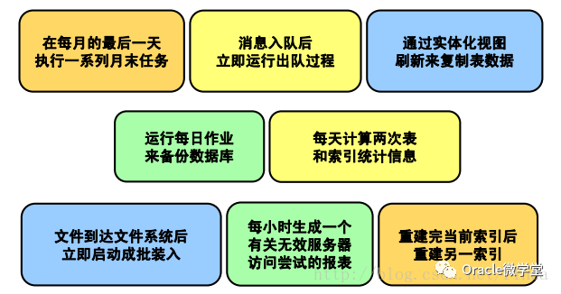 Oracle 环境中的许多任务都需要作业调度功能。例行的数据库维护和应用程序逻辑要求定期调度并运行作业。企业到企业(B2B) 应用程序要求对其业务事件进行调度。DBA 需要在指定时间窗口中调度定期维护作业。