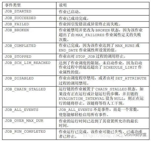 你可以对作业进行配置,使调度程序在作业的状态更改时引发事件。可以通过设置raise_events作业属性来完成此操作。默认情况下,在变更作业的raise_events属性之前,作业不会引发任何状态更改事件。要变更此属性,必须先使用CREATE_JOB过程创建作业,然后使用SET_ATTRIBUTE过程修改此属性的默认值。本例显示hr.do_backup作业已变更,使得该作业在失败时引发事件。为作业启用作业状态更改事件后,调度程序将引发这些事件,方法是将消息入队到默认的事件队列SYS.SCHEDULER$_EVENT_QUEUE中。
