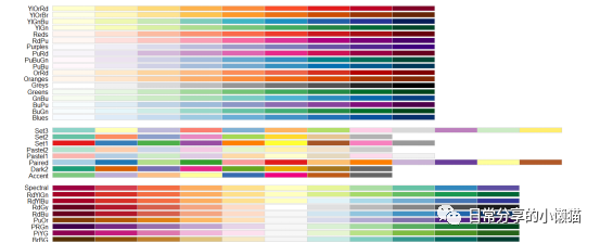BrBG、PiYG、PRGn、PuOr、RdBu、RdGy、RdYlBu、RdYlGn、Spectral、Accent、Dark2、Paired、Pastel1、Pastel2、Set1、Set2、Set3、Blues、BuGn、BuPu、GnBu、Greens、Greys、Oranges、OrRd、PuBu、PuBuGn、PuRd、Purples、RdPu、Reds、YlGn、YlGnBu、YlOrBr、YlOrRd