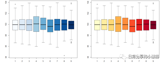 boxplot(rand.data,col = brewer.pal(9,"YlOrRd"))
