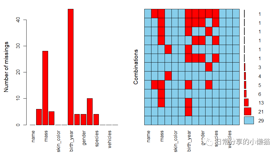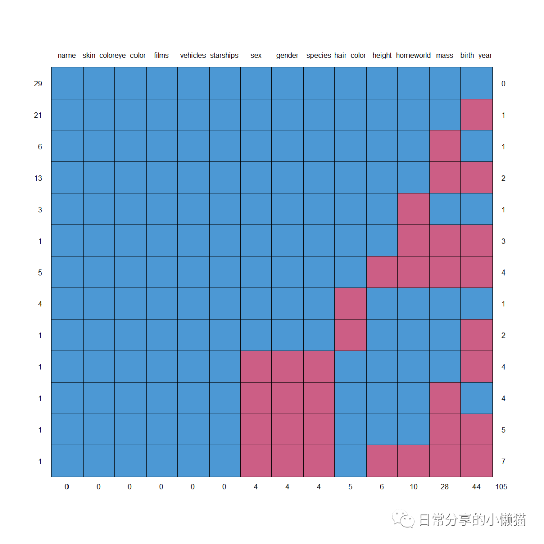 该函数会自动生成一个关于缺失值的数据及图形。数据中,0表示含有缺失值,1表示没有缺失值,第一列为没有缺失值的案例数,最后一列为缺失值变量的个数,最后一行为该变量缺失值的个数。图形为数据的可视化呈现。