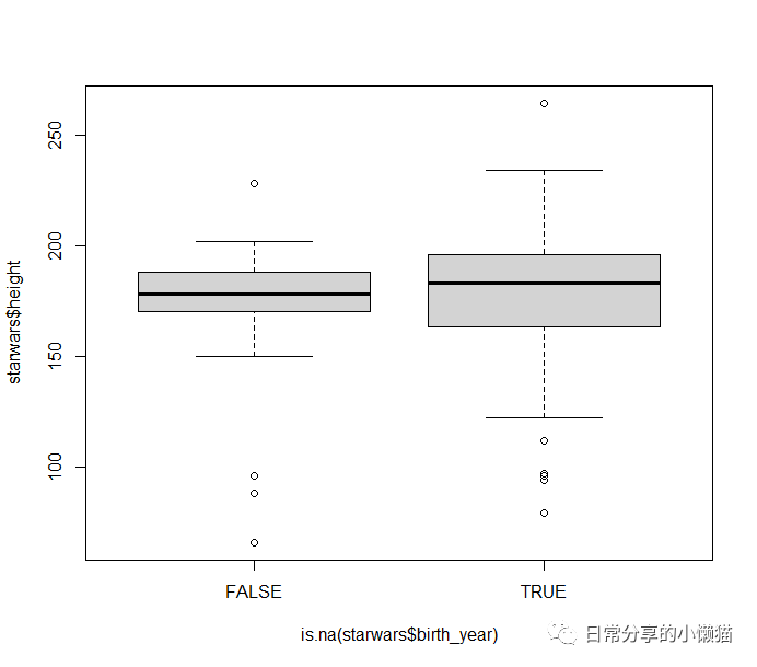 boxplot(starwars$height ~ is.na(starwars$birth_year))