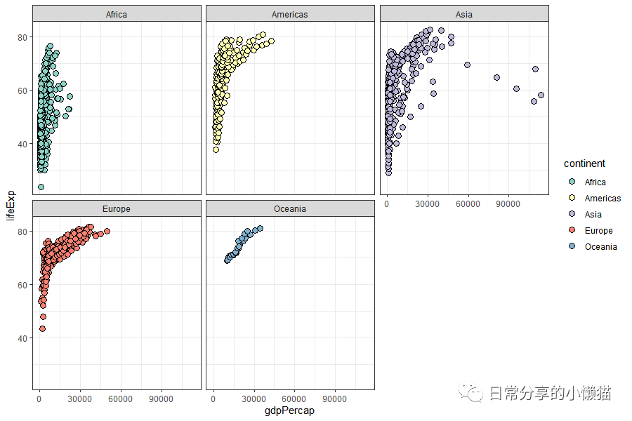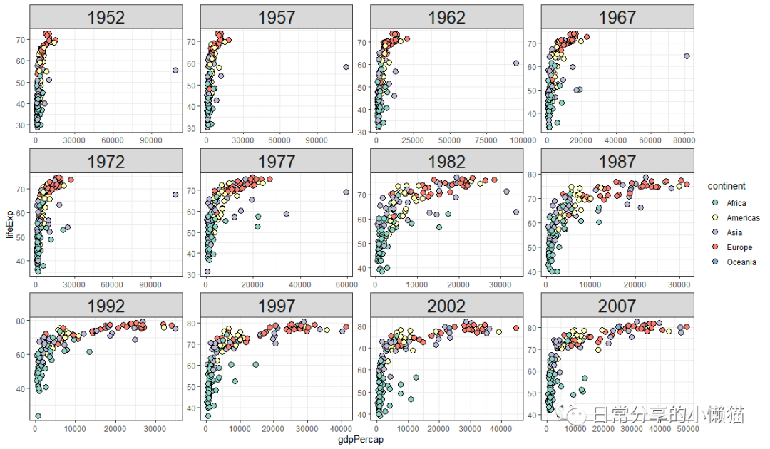 本文主要展示在R语言中如何利用ggplot2和gganimate包绘制分面散点图及分面动态散点图[1]。绘图效果如下: