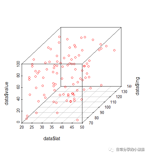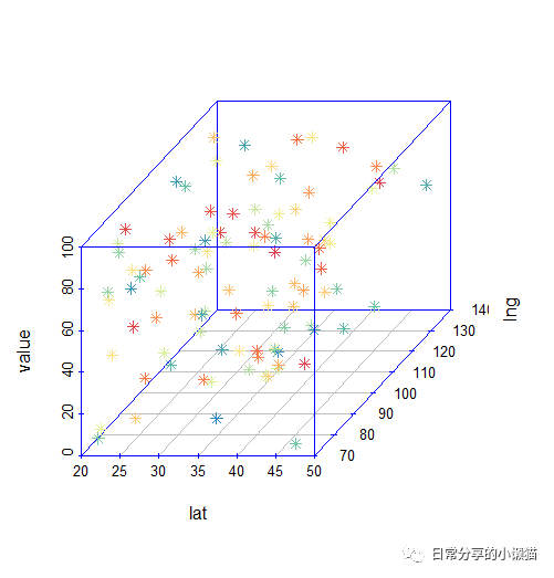 scatterplot3d(x = data$lat, y = data$lng, z = data$value, pch = 8, angle = 45,