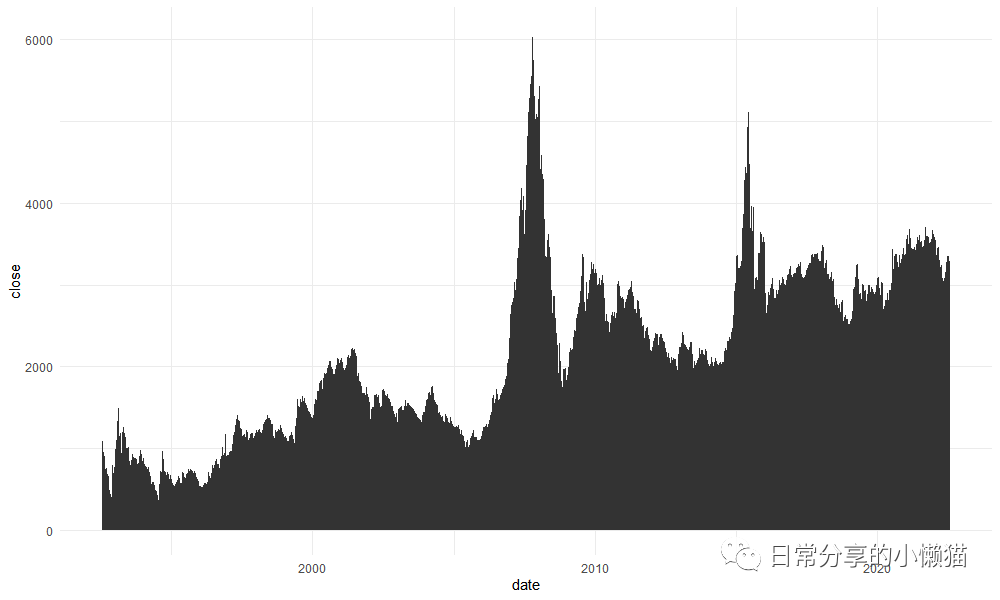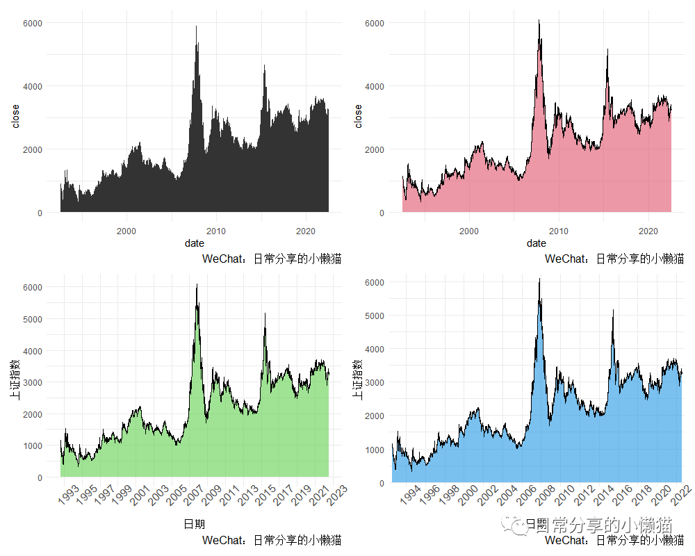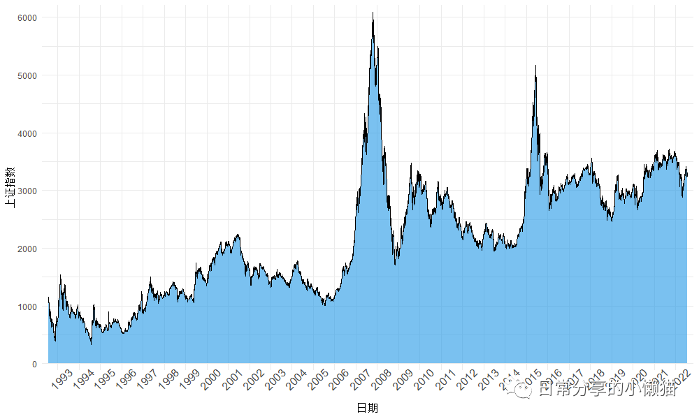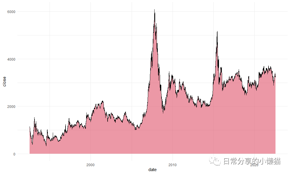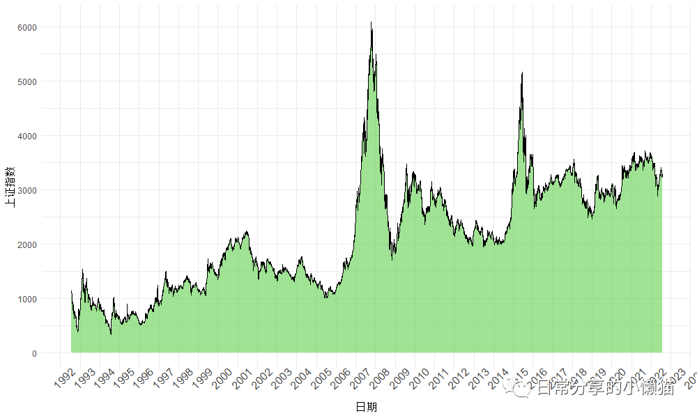 面积图(Area chart) 可用于表示数量随时间的变化程度,是论文或报告中一种常见图形。本文以上证指数为例,展示如何利用ggplot2绘制面积图。图形效果如下图所示: