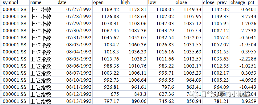 #1 000001.SS 上证指数 1992-07-27 00:00:00 1169. 1179. 1108. 1149. 1142. 0.640