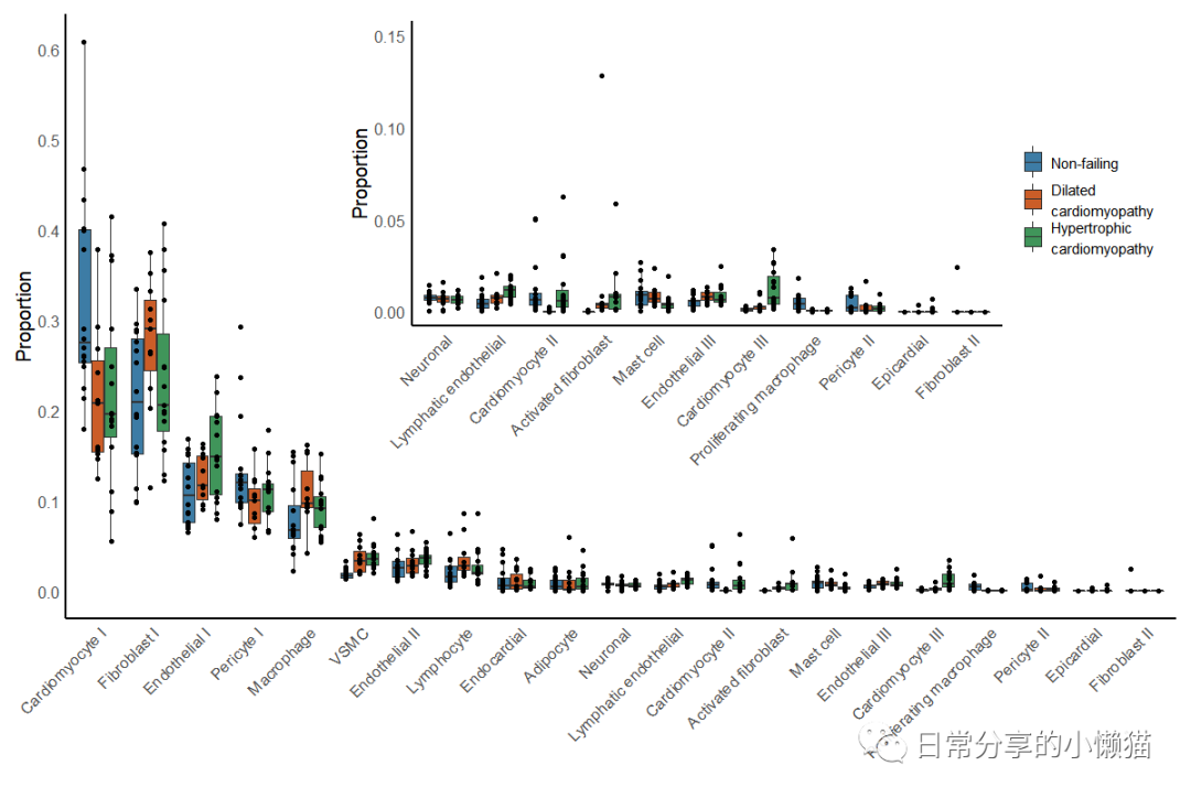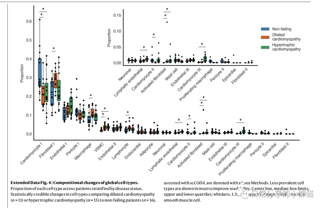 本文主要展示如何利用R语言绘制来自nature期刊Single-nucleus profiling of human dilated and hypertrophic cardiomyopathy[1]一文中的Extended Data Fig.4。该图由散点图、箱线图等组成,用于展示细胞类型组成变化状况,同时该图又由两幅图组成,需要对图进行拼接。如下图所示:
