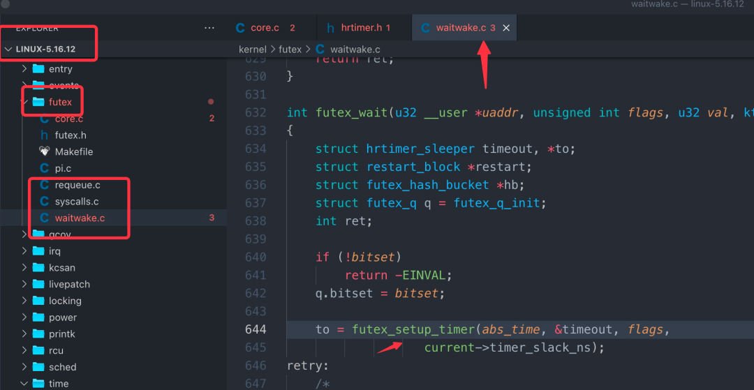 我们先不管这些乱七八糟的同步术语和函数的版本差异,在kernel/futex/waitwake.c (Linux-5.16.12)中,我们能够看到相关的函数调用。